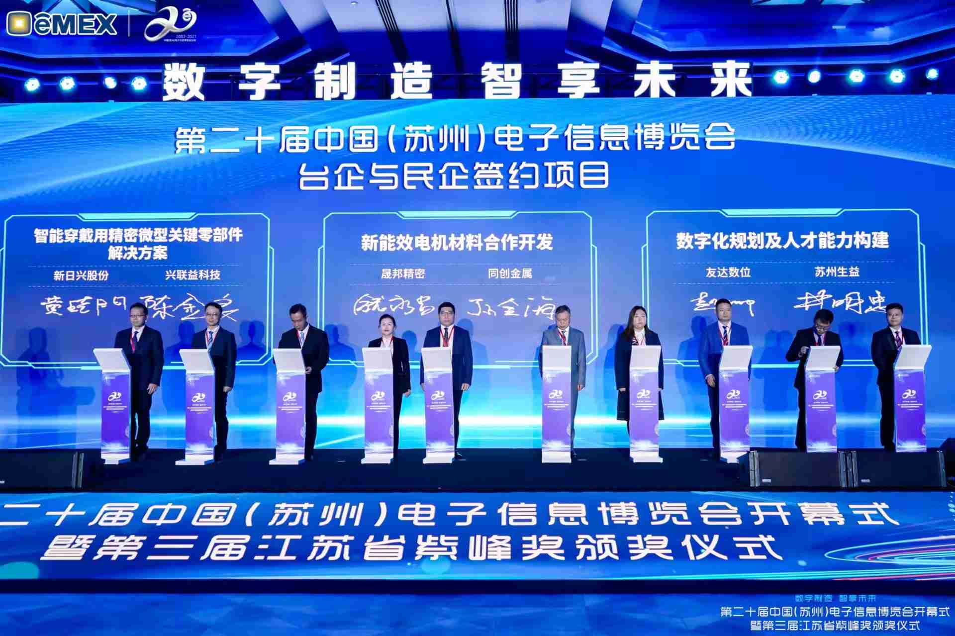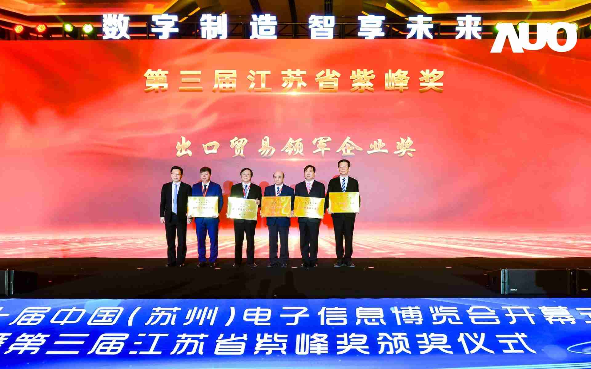 电博会开幕式当天也是第三届江苏省紫峰奖颁奖仪式,,,,省台办、、、、工信厅、、、、商务厅、、苏州市相关领导均出席并颁奖。。。该奖项为表彰对江苏高质量发展做出积极贡献的在苏企业,,,由江苏省政府专门设立。。。NG大舞台光电 (苏州) 总经理郭振明代表上台领奖,,,这也是NG大舞台苏州连续三次蝉联紫峰奖 出口贸易领军企业奖。。。。NG大舞台数位总经理赵丽娜女士,,,也参与本次开幕式,,,上台为本地化赋能签署战略合作协议,,,将优质服务资源集合、、、、下沉到更多细分行业,,,为更多地区的制造企业提供数字化转型服务。。。