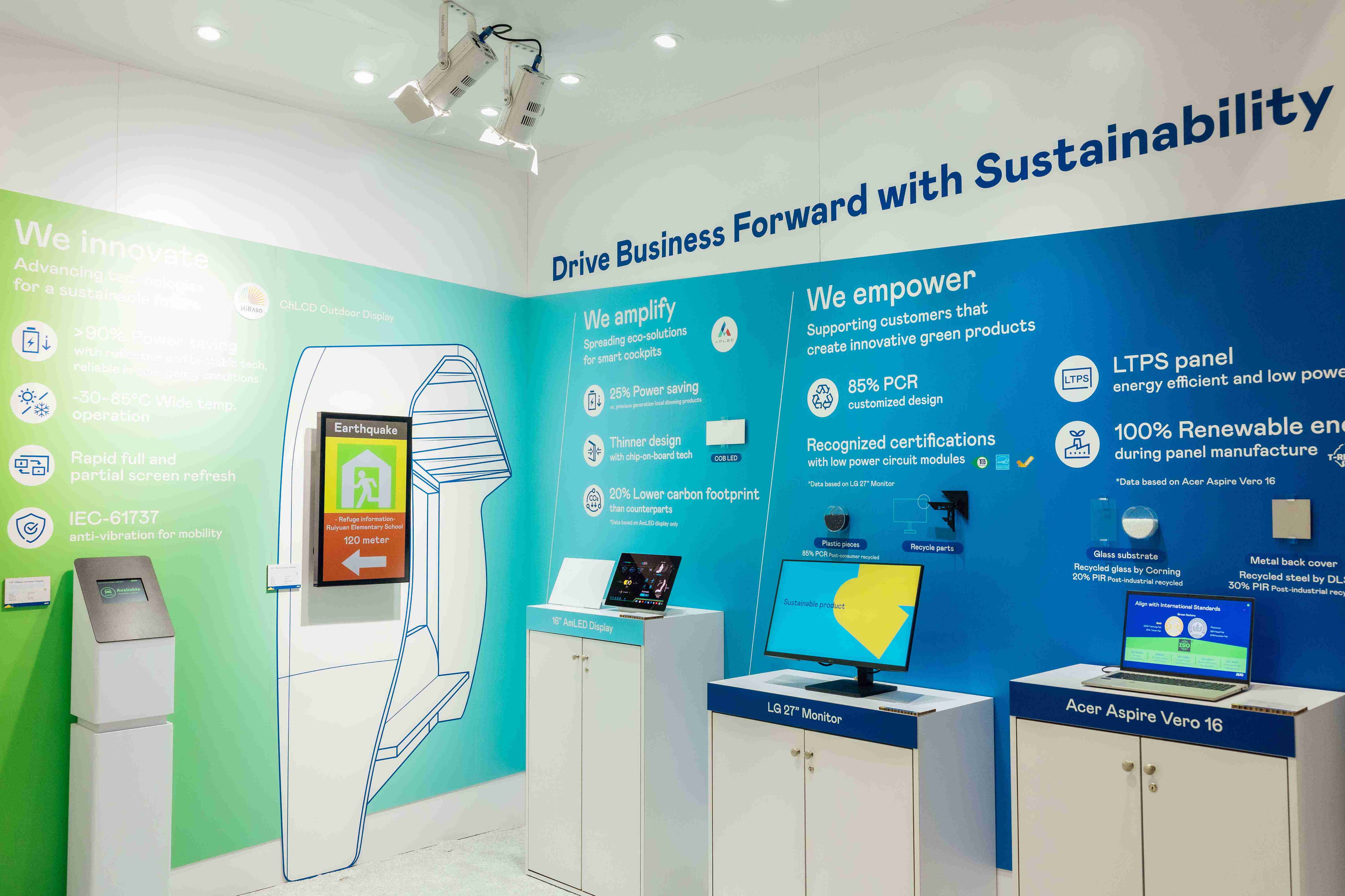 NG大舞台运用创新显示技术HiRaso胆固醇液晶双稳态技术达到显示零耗能、、扩大节能省电的AmLED显示技术应用于车用产品、、、以再生的消费后回收(PCR)塑料及全绿电生产之面板,,,应用于笔电及萤幕,,,增加绿色价值。。。。