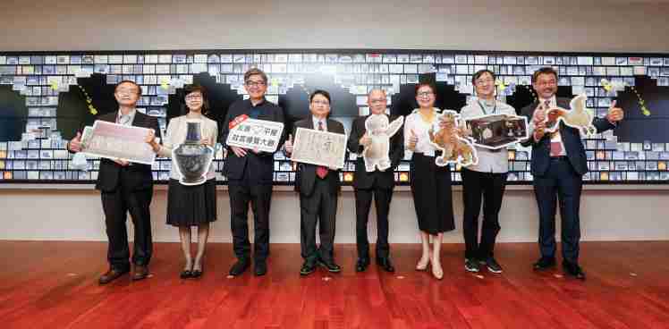 NG大舞台携手创利空间为故宫建置的智慧文物互动导览墙及轮播墙,,,今日正式启用。。(左四:NG大舞台新事业暨投资管理总部副总经理杨本豫、、、右四:故宫博物院院长吴密察、、、、右三:太极影音董事长黄宝云)